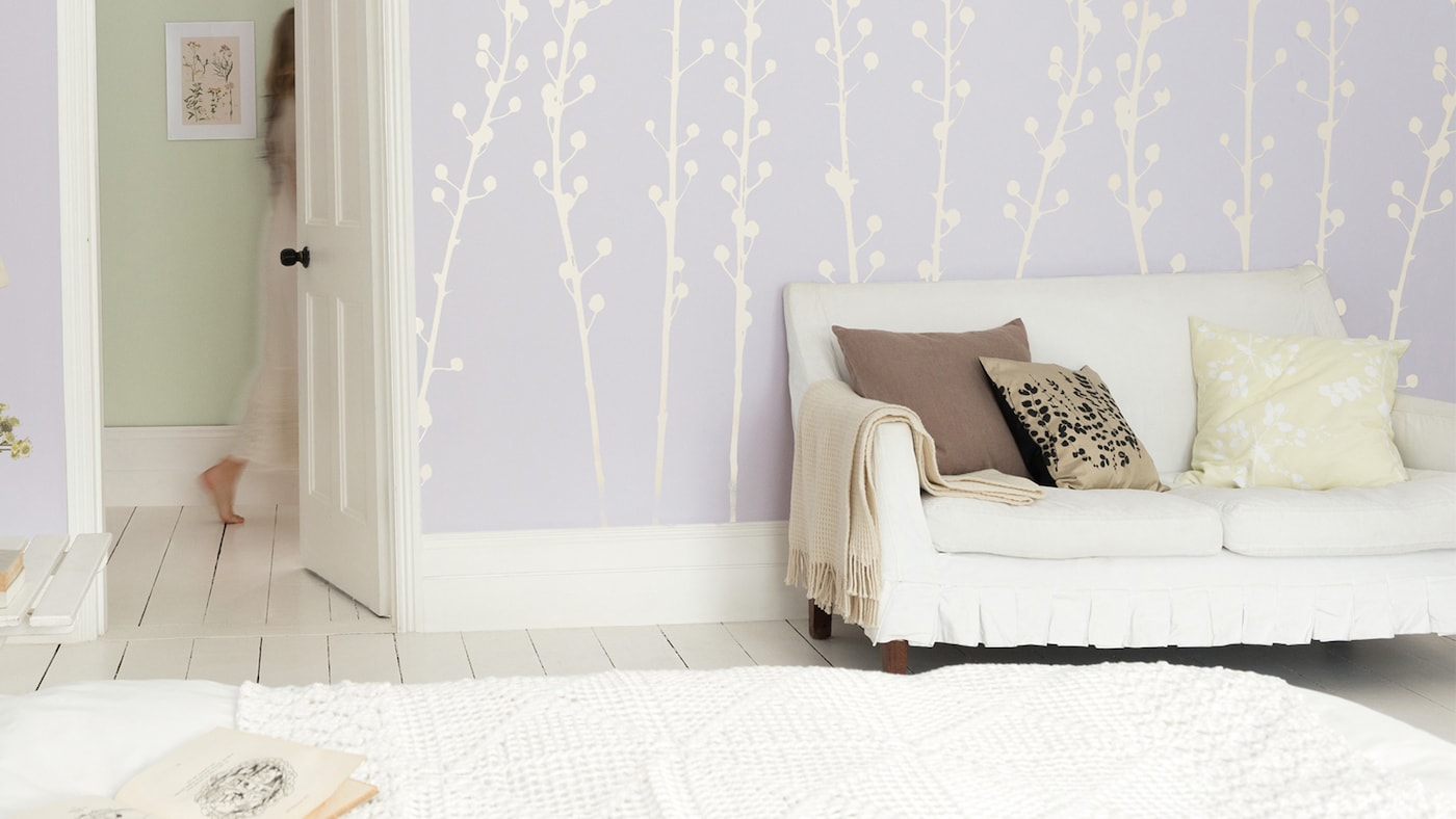 Si te encanta la idea de tener un jardín en flor todo el año, ¿por qué no probar con flores estarcidas de gran tamaño para crear un diseño botánico audaz? La clave de este estilo es crear un foco de atención con dramatismo, por lo que te recomendamos usar un espacio grande de pared y una paleta de colores simple con dos tonos complementarios (como lila y crema, o gris carbón y naranja) para lograr que el diseño resalte.