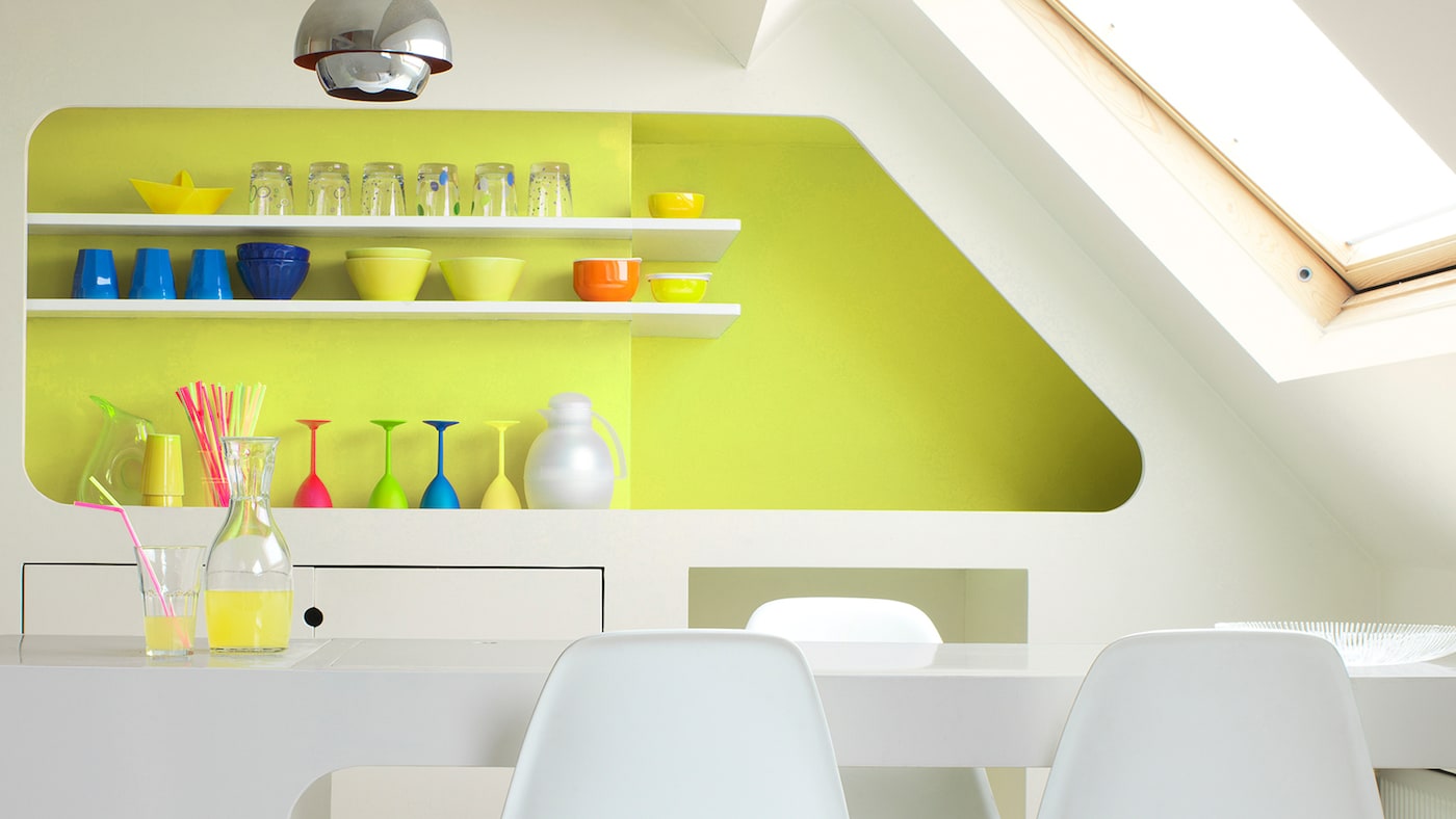 Una pincelada de chartreuse hará maravillas y romperá con los tonos neutros de cualquier ambiente, en especial si se utiliza en espacios inesperados, como las molduras de las ventanas, los marcos de las puertas y en el interior de alacenas y bibliotecas. Cuando se utiliza para realzar, el chartreuse combina a la perfección con el gris carbón y luce fresco y vigorizante con el blanco intenso. Además, luce fabuloso cuando se combina con variados tonos de blanco y de madera cálida, como el roble y el madero.
