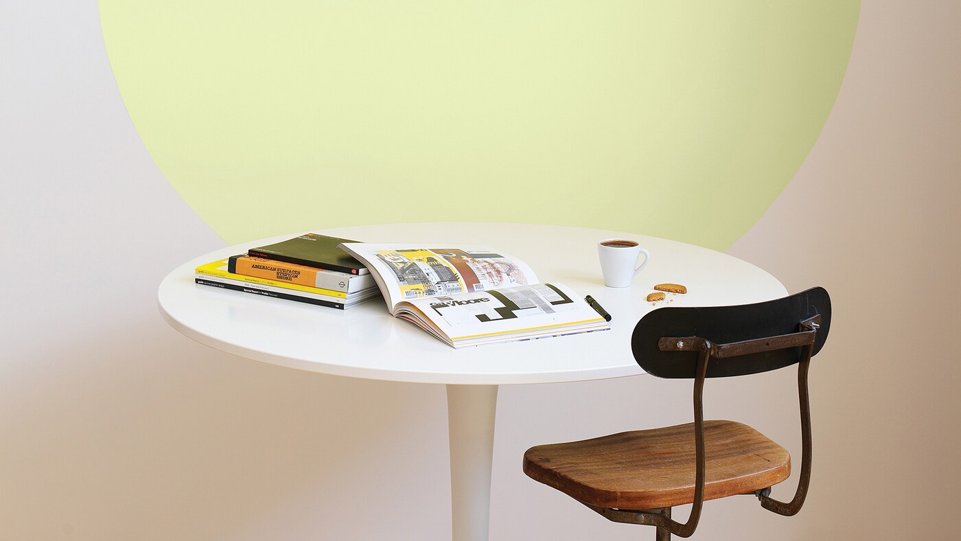 Un círculo amarillo agrega diversión y color a un comedor blanco.
